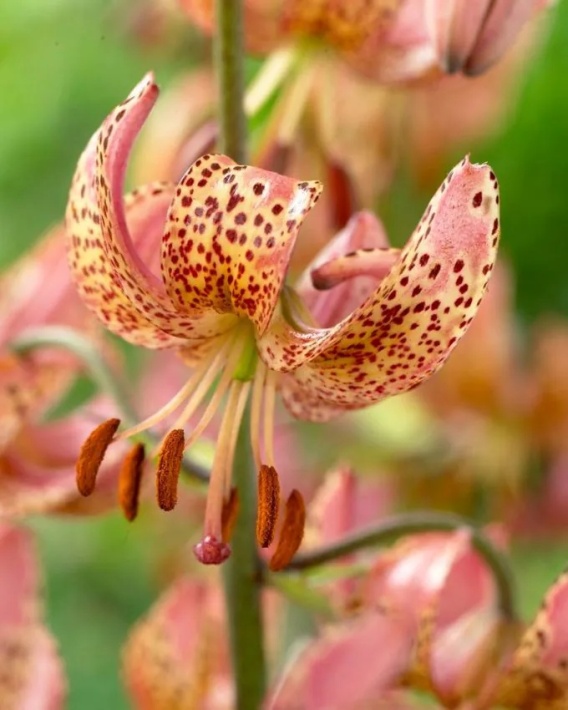Lilia ‘Manitoba Morning’ to bardzo dekoracyjna i trwała odmiana z grupy lilii martagon (tzw. lilie tureckie), wyróżniająca się licznymi, zwisającymi kwiatami o mocno odgiętych płatkach. Kwiaty mają różową barwę z intensywnym, czerwono-brązowym cętkowaniem, co nadaje roślinie wyrazisty, a jednocześnie naturalny charakter.