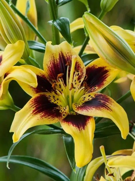Lilia ‘Pieton’ to wyrazista i bardzo dekoracyjna odmiana z grupy lilii azjatyckich, która przyciąga uwagę kontrastowym zestawieniem kolorów. Jej żółte płatki z intensywnym, ciemnoczerwonym centrum oraz delikatnym cętkowaniem tworzą efektowny rysunek, nadając kwiatom dynamiczny, niemal egzotyczny charakter.