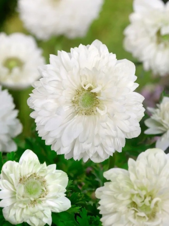 Anemone coronaria ‘Mount Everest’ z grupy St. Brigid to elegancka odmiana zawilca o pełnych, śnieżnobiałych kwiatach z delikatnie zielonkawym środkiem. Gęsto ułożone płatki tworzą efektowne, niemal kuliste kwiaty, które prezentują się wyjątkowo szlachetnie zarówno w ogrodzie, jak i w bukietach.